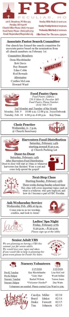 As we look ahead, I encourage you to begin praying for our Associate Pastor Search Team. They will meet for the first time this coming Sunday afternoon. I believe that finding the right man to help pastor our church will be a huge blessing for our congregation. While the search team helps find a man to recommend to the congregation it is ultimately us, the church body, that approves a man to be called as pastor of FBC Peculiar. This is an important responsibility and I encourage you to also pray for your heart and part in this process. The Lord is good and gracious to us. Let us look forward to how he will bless us through this process.